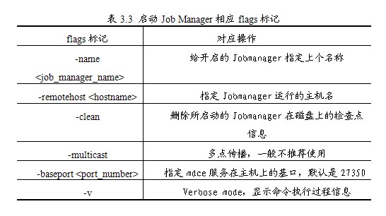 如startjobmanager -name MyJobManager 即在本地机器上开启一个名为MyJobManager的作业管理器,startjobmanager -name myjm -remotehost SQY 则是在主机SQY上开启一个名为myjm的作业管理器。这个过程要保证网络畅通互连,并各机器运行mdce服务。在集群上可开启多个Job Manager,但名称要唯一,不能重复。如果要停止一个作业管理器,则用stopjobmanager –flags 格式与上基本相同,不同重述。查看其运行状态可用语句nodestatus -remotehost <job manager hostname>,然后再开启worker,语句格式为start worker –flags ,flags为操作标记,如表3.4所示