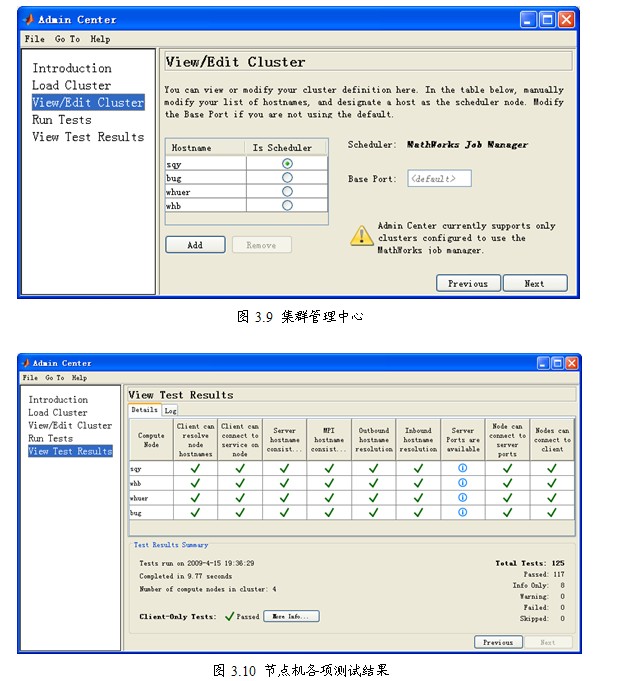 MATLAB还提供了图形用户界面Admin Center 来管理集群机器,点击MATLAB主菜单“parallel”下的“Admin Center”,即可进入管理中心图形用户界面,可以载入建立好的局域网集群,查看、编辑和添加节点机,如图3.9所示,进行客户端机器、节点机之间的连接、端口及主机名一致性等测试,最后给出测试结果,如图3.10所示。在测试前注意先关闭防火或设置相应的例外程序和端口,不然可能会出现各节点机连接测试失败的情况。